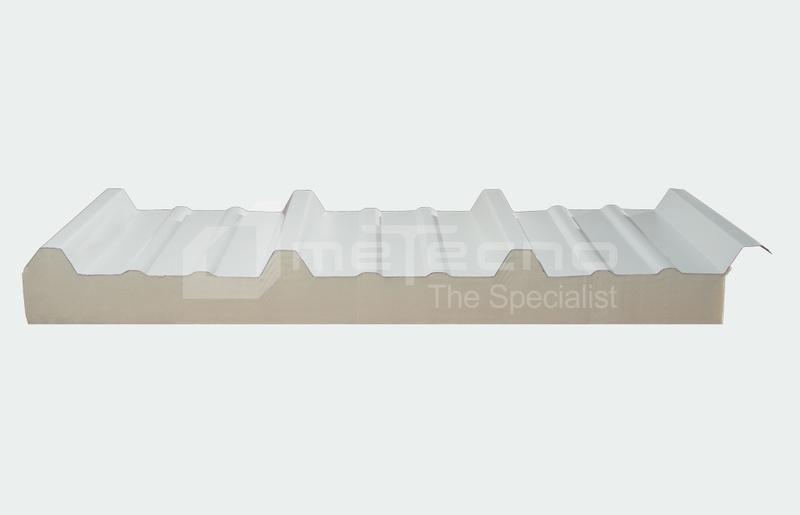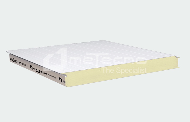 Panel de techo de diseño estándar, cara externa de lámina de acero, interna lisa de plástico reforzado con fibra de vidrio (FRP), aislante de poliuretano (PUR).