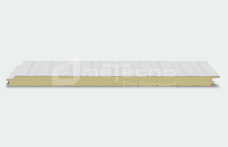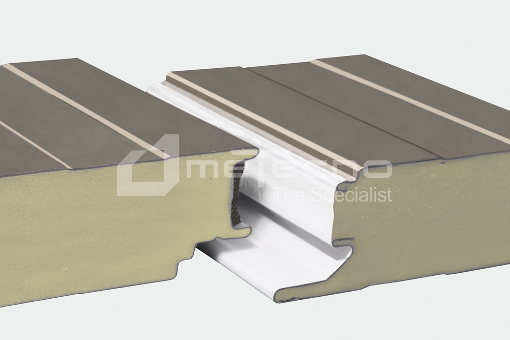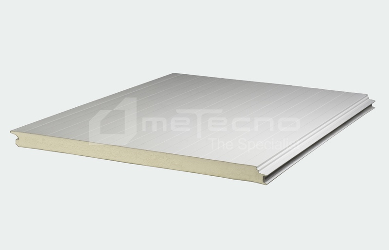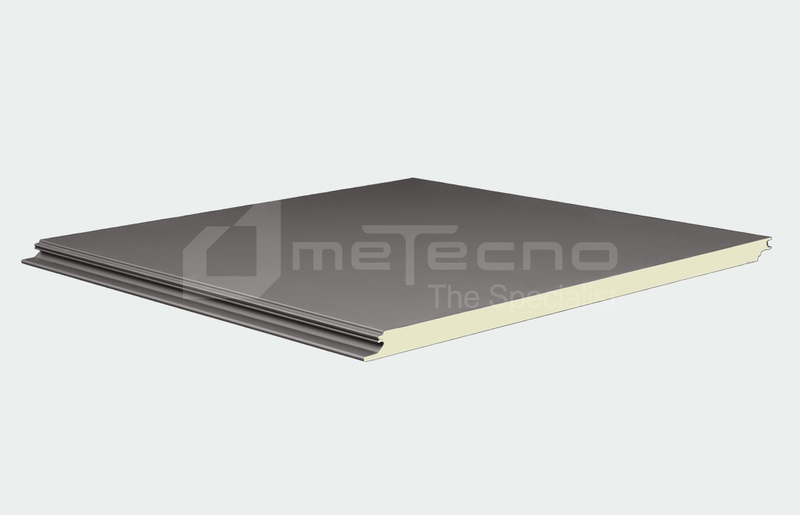 Panel plano para muros y plafones, fijación oculta, caras de lámina con dibujo tableteado, aislante de poliuretano (PUR) de gran espesor.